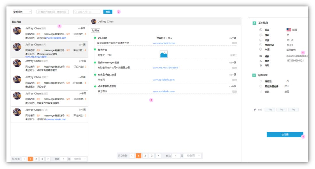 Melark通过识别来自于官网/广告/落地页的社交身份用户,主动出击,主动沟通,做好售前客服,提升询盘率。从无形中产生新获客价值。通过追踪每个用户的来龙去脉,兴趣与意向动态,为其提供高价值的个性化服务,针对新客户提高转化率,针对老客户提高复购与订单额。